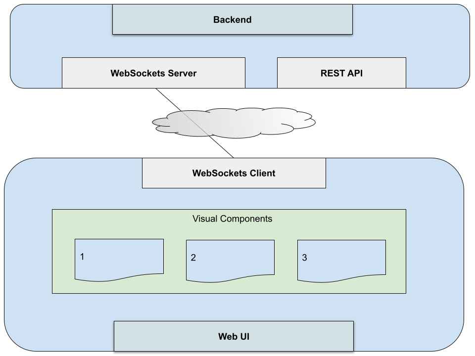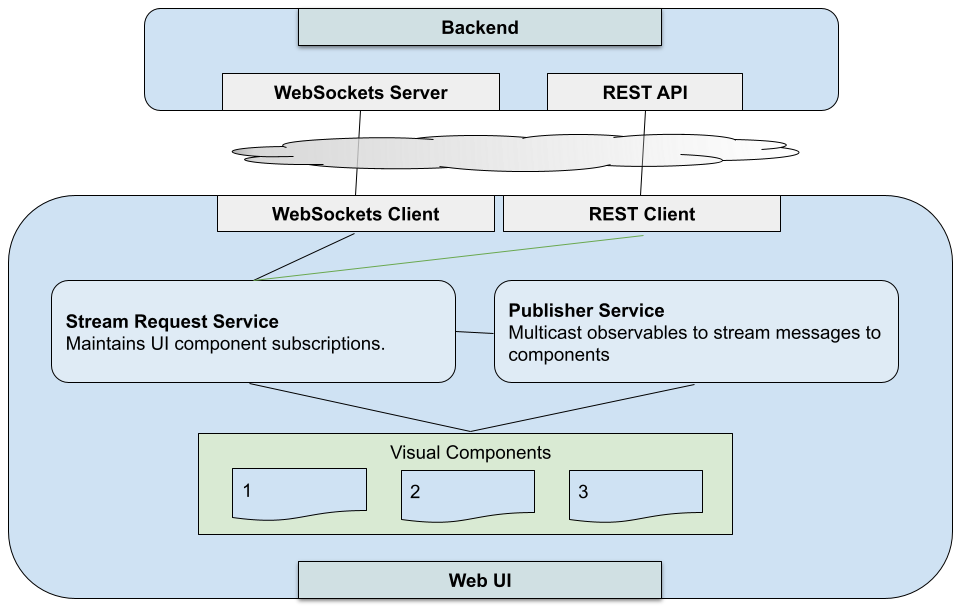 Note that while we haven’t discussed it, we have the option of a REST service in this topology. This is because some back-ends will require REST calls to subscribe to data, while others will require messages via your WebSockets pipe. If you are just subscribing to data, there is no real right or wrong answer for which method is ideal. The important thing is that once the subscription is honored, receiving data comes through the WebSocket to provide one consistent pipeline of a single timeline. The client hopefully never has to combine REST and WebSockets to construct the actual state of data being subscribed to. That is, you wouldn’t want to have to combine both REST and WebSockets to construct the complete quote of IBM. Your WebSocket provides a single timeline of streaming events and data so your UI components can focus on consumption and presentation.